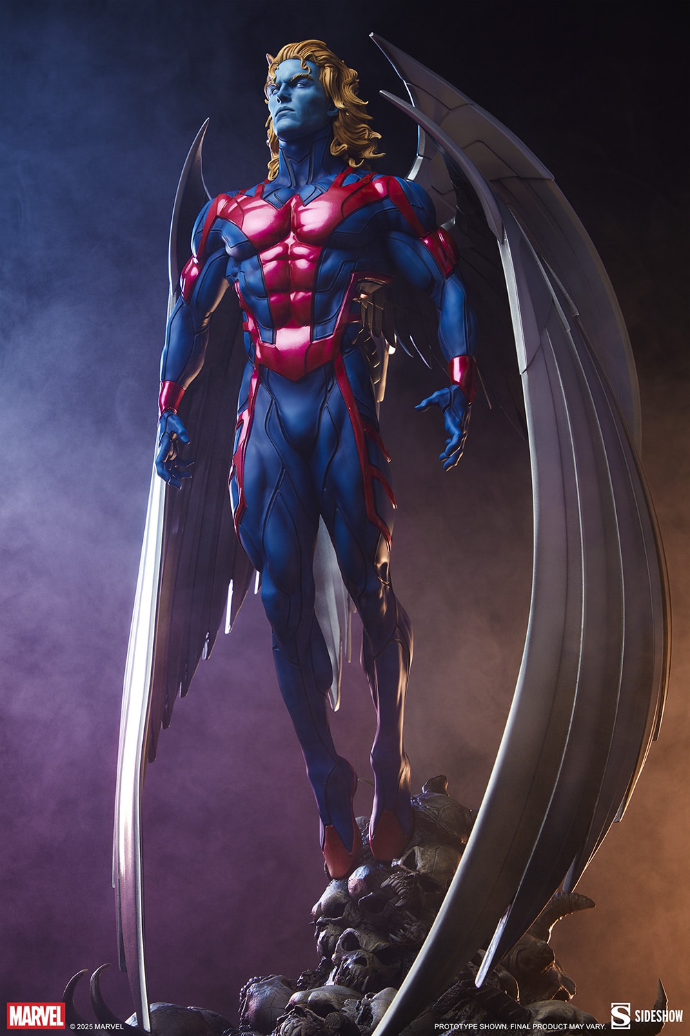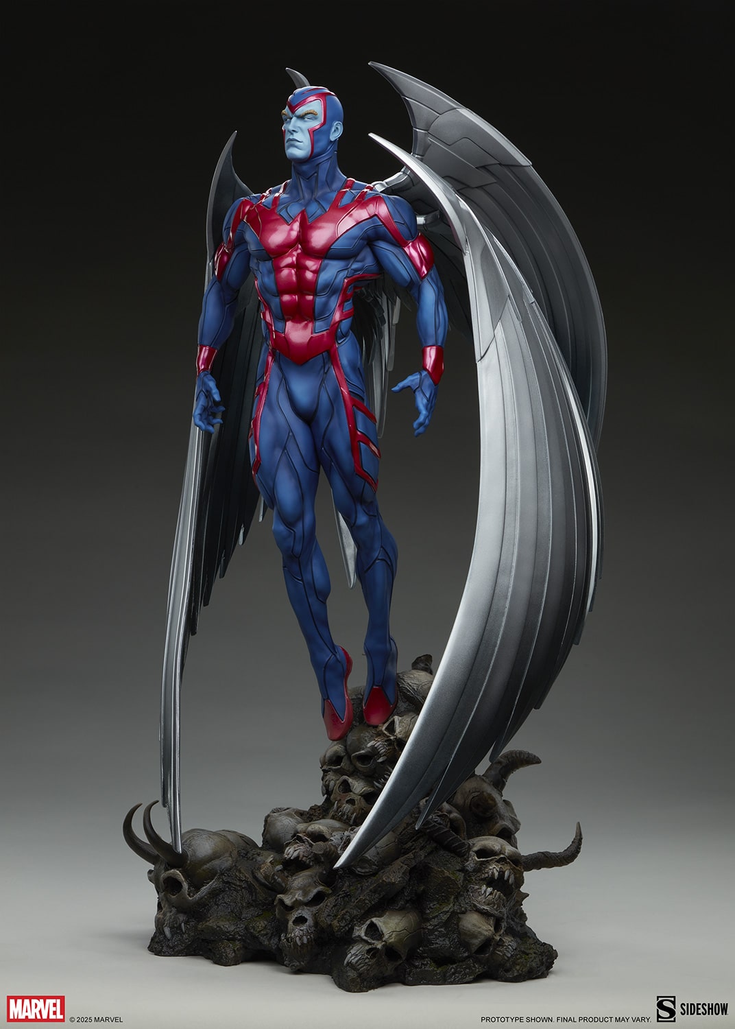 Savior, killer, harbinger of hope or destruction. The Archangel Premium Format figure measures 28.75” tall, 16.8” wide, and 13.37” deep as Warren Worthington III hovers above a pile of infernal skulls. With his razor-sharp metal wings folded around his body like armor, Apocalypse’s lethal henchman surveys a battlefield rife with monsters and death. He is unstoppable as an instrument of evil — but his ascension came at the cost of his fall from grace.