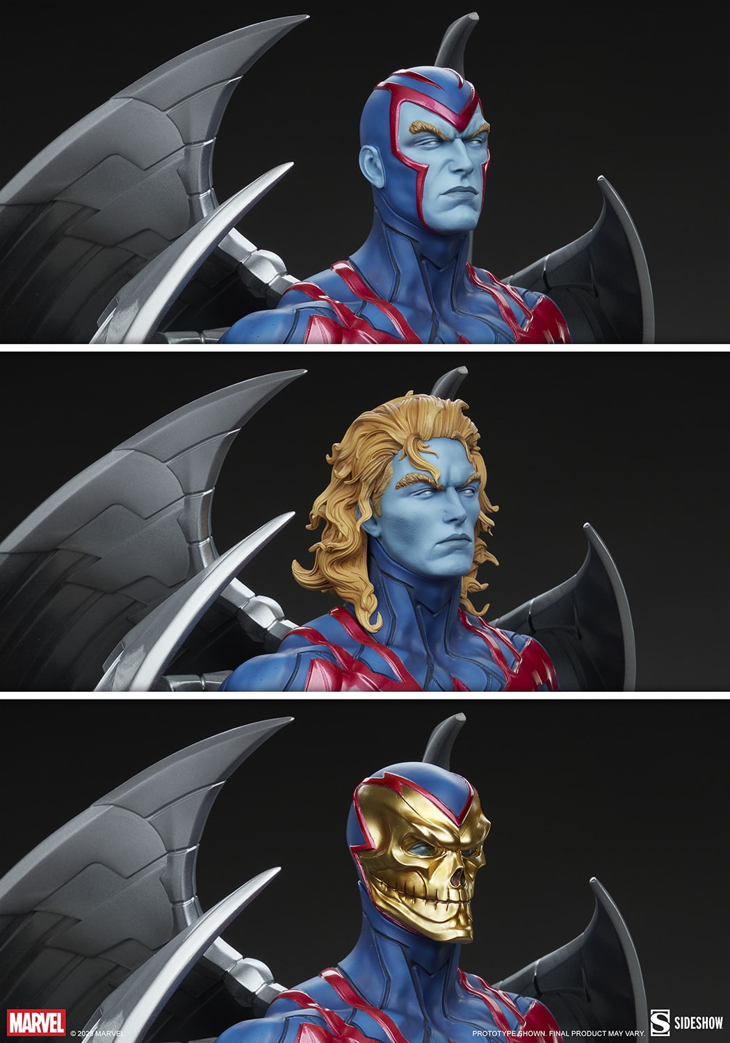 This fully sculpted X-Men collectible depicts Warren Worthington III after his transformation into the Eternal One’s Horseman of Death. He wears his classic blue and magenta costume over blue skin, a drastic color change brought on by extensive genetic alterations. Stripped of his own wings, four sets of poisonous blades instead protrude from Archangel’s back and shoulders as he flies above a base created from demonic bones. The Archangel Premium Format Figure features three swap-out portraits, including a cowled head, a head with the character’s gold Death mask, and an unmasked head showcasing Warren’s loose blonde curls. Each option increases the range of display, allowing fans to explore various steps in Archangel’s journey through rage, revenge, and redemption.