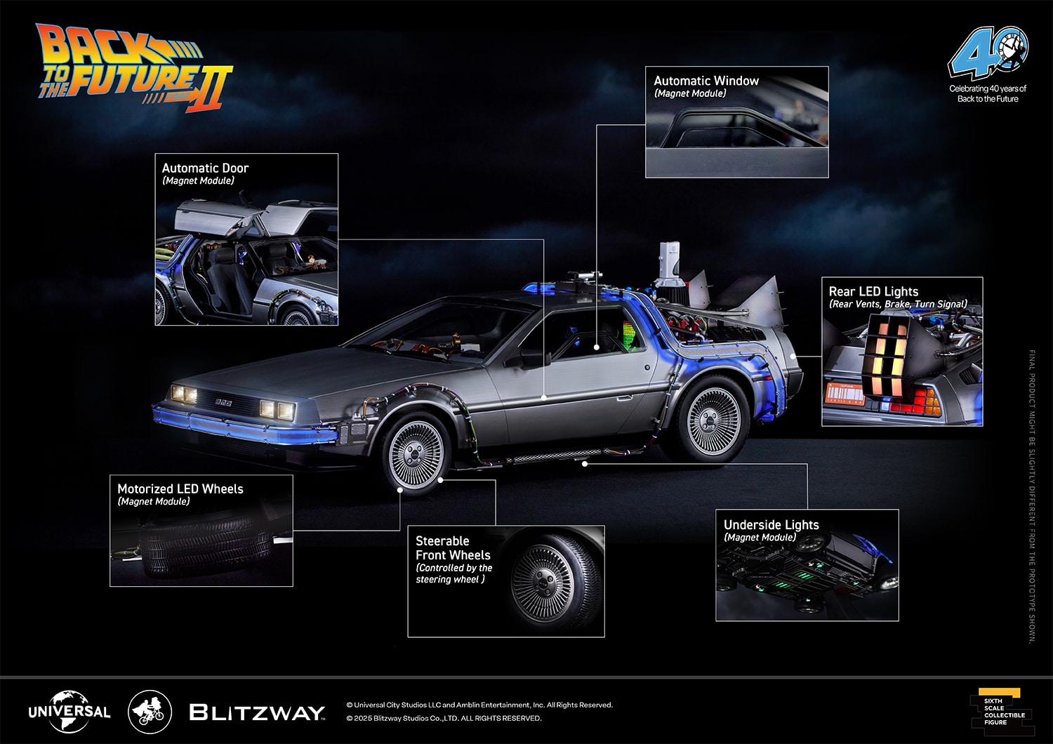 With 8 Key Features, BLITZWAY invites fans to relive the excitement of Back to the Future Part II, capturing the nostalgia and wonder of the Time Machine as if it had traveled 40 years to arrive before you today.