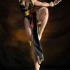 Measuring over 36” tall, Chun-Li stands ready for action, she is balanced gracefully on one foot, poised to deliver her fearsome hurricane kick. Wearing the elegant black dress of her alternate “Battle” look, this beautifully tailored garment is decorated with gold trim and hangs nearly to her feet. Her hair, usually pinned up in her trademark ox-horns, is worn down with a small braid over either ear. A pair of spiked white bracelets with a hammered gold belt fastened with an ornate knot and an understated pair of white ballet flats complete her evening-ready look.