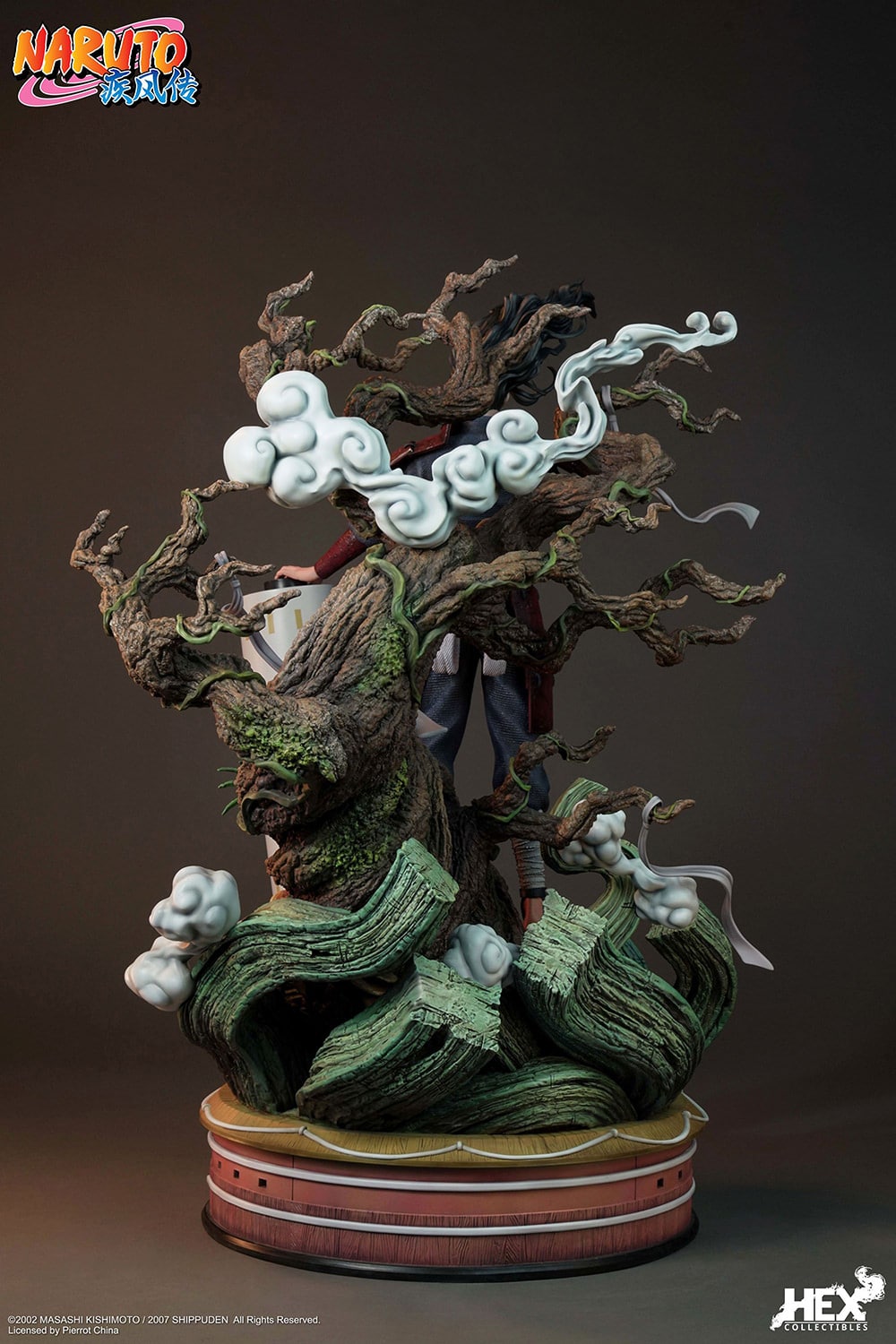 Twisted branches grow behind him, adding to the intricate and realistic texture of the statue. The round pedestal is designed to resemble the Hokage Residence, with the emblem of the Senju clan adorning the center, imbuing the piece with a sense of history and reverence.