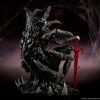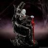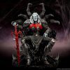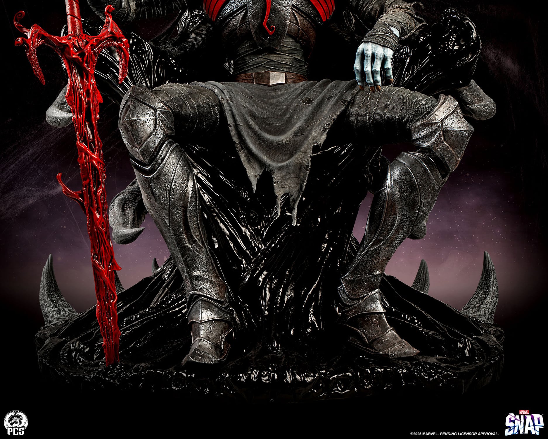 This fully sculpted statue measures an impressive 33” tall and depicts the interstellar deity seated confidently atop his throne with his sinewy red symbiote sword at his side. Knull is outfitted in a set of dark armor emblazoned with a vibrant red spider on the chestplate. His arms and legs are wrapped in tattered fabric straps, sculpted here with amazing detail. His throne has the smooth, glasslike texture of the symbiote in liquid form. Jutting out from his monstrous seat are massive, ancient looking spider legs extending outward and almost embracing the King in Black.