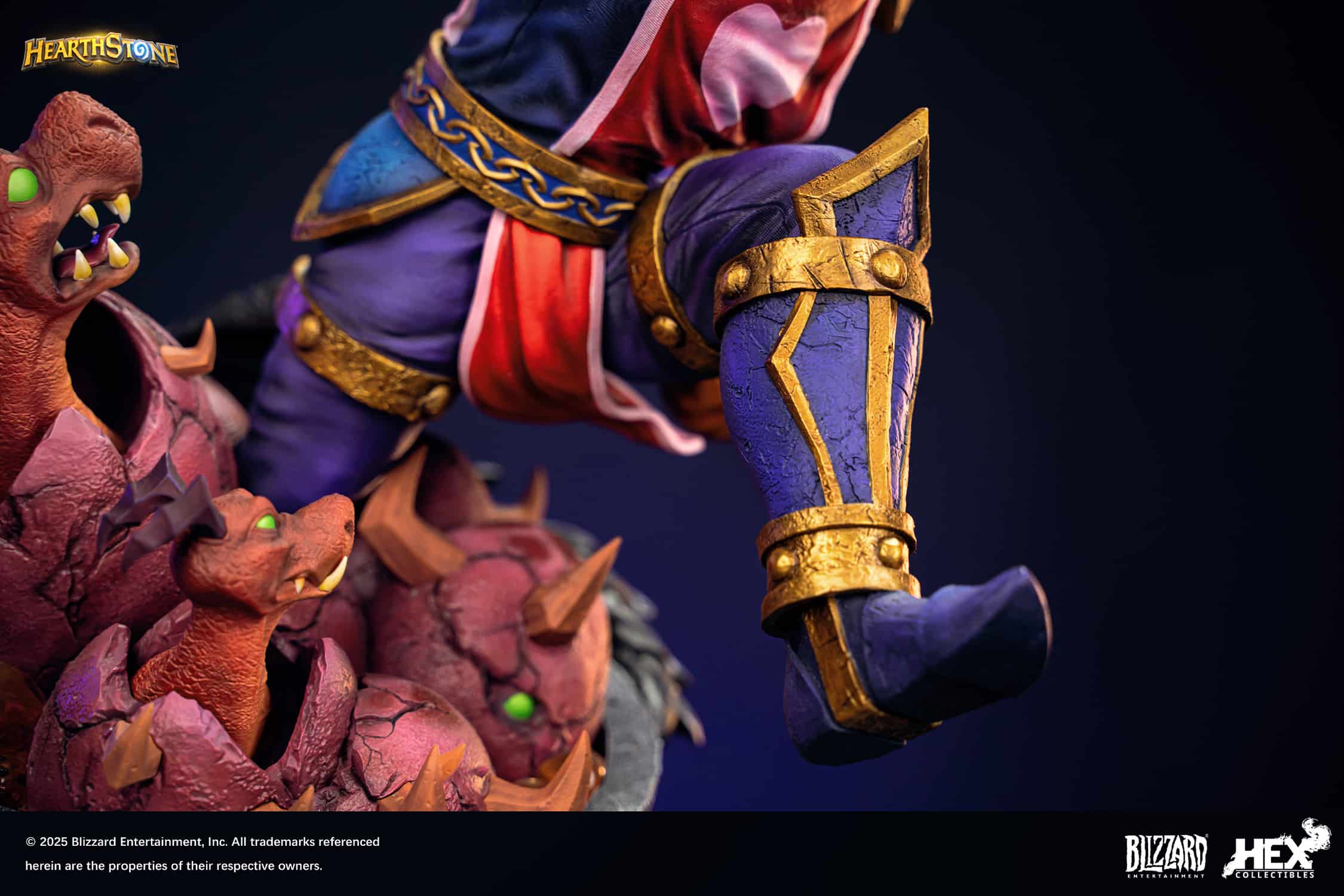 Leeroy runs across the Rookery of Upper Blackrock Spire, crushing dragon whelp eggs underfoot as they lie strewn about – some already hatching with stunned whelps watching Leeroy’s reckless onslaught. Classic elements such as card’s Attack value, Health value, and Rarity gem are prominently featured on the base, paying homage to the original card design.
