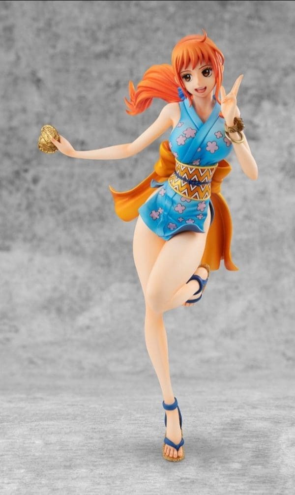 This Portrait of Pirates figure features Nami (O-Nami) wearing a revealing blue and orange kunoichi outfit from the Wano Country Arc in the anime series One Piece.