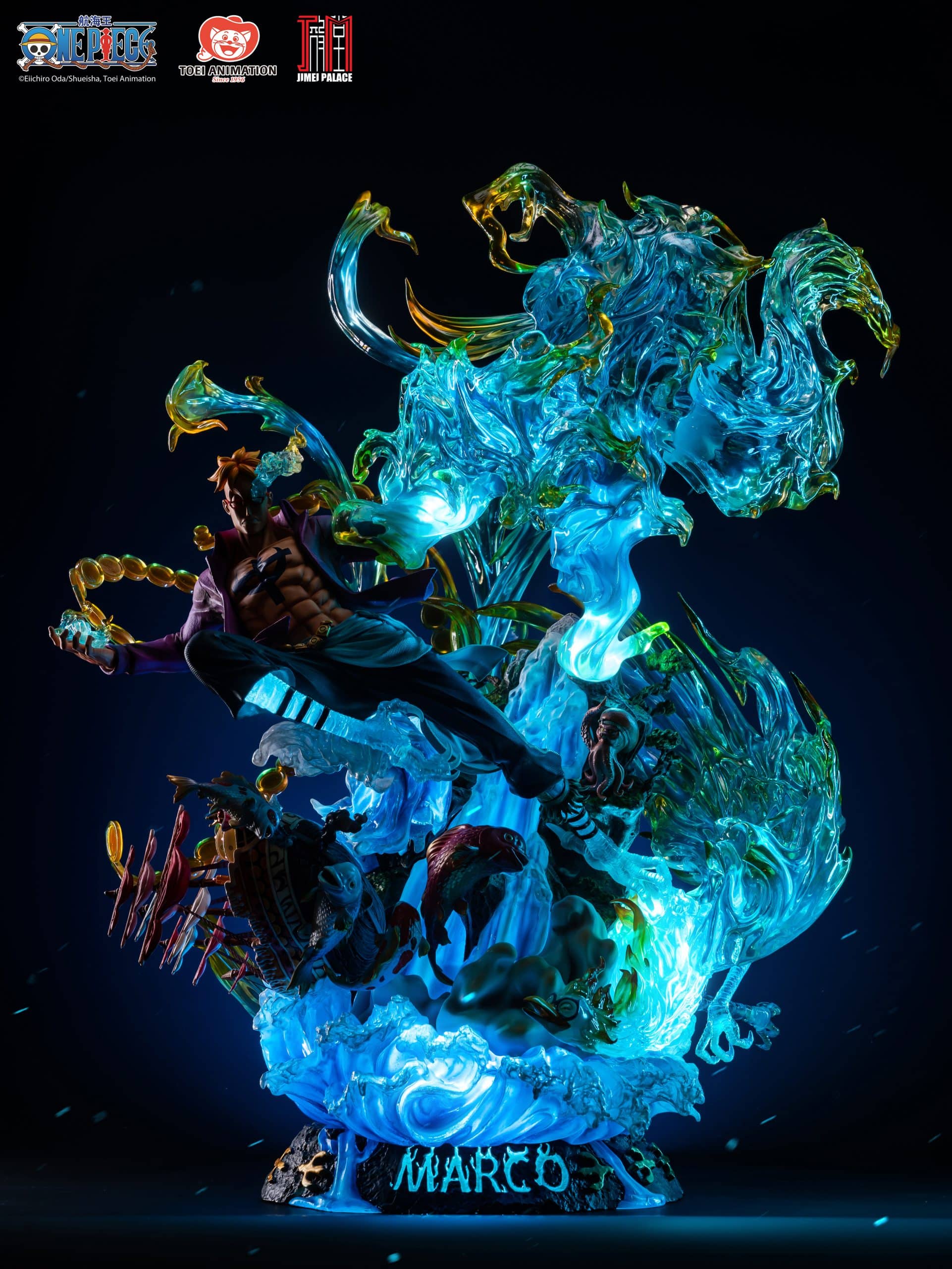 Jimei Palacework presents their latest One Piece statue, Marco. Demonstrating a scene pulled from the Wano Country Saga, Marco battles Big Mom at Wano Country’s waterfall entrance. As Marco kicks her ship back, sea creatures climb the waterfall, including the spring octopus who once snuck onto the Thousand Sunny.