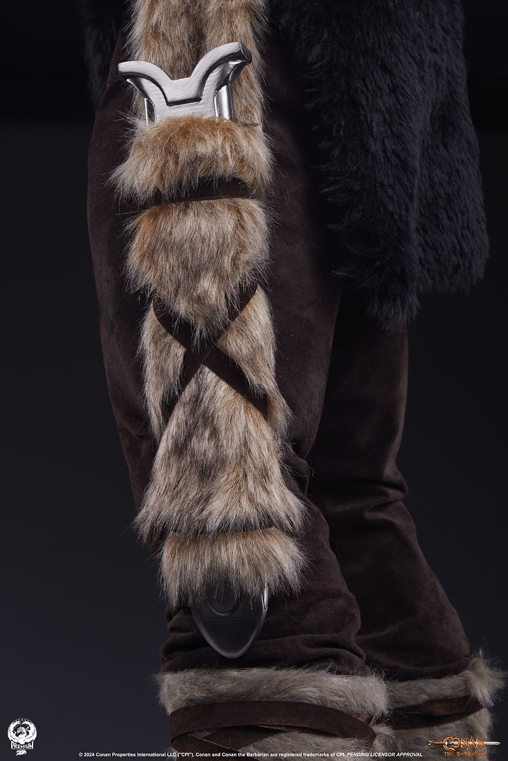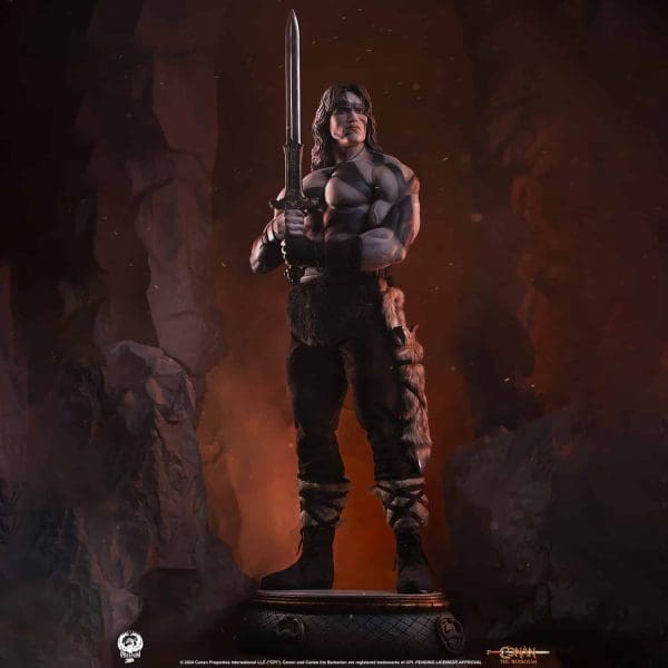 Standing at a staggering 46” tall, this is the definitive Conan the Barbarian statue. Featuring an uncannily accurate portrait of Arnold Schwarzenegger in his iconic role, this collectible brings the Cimmerian warrior to life as never before. The Conan 1:2 Statue features a costume masterfully crafted in real fabric including pants, gauntlets, boots with faux fur trim and a faux fur covered sheath at his hip.