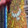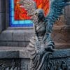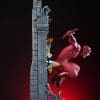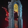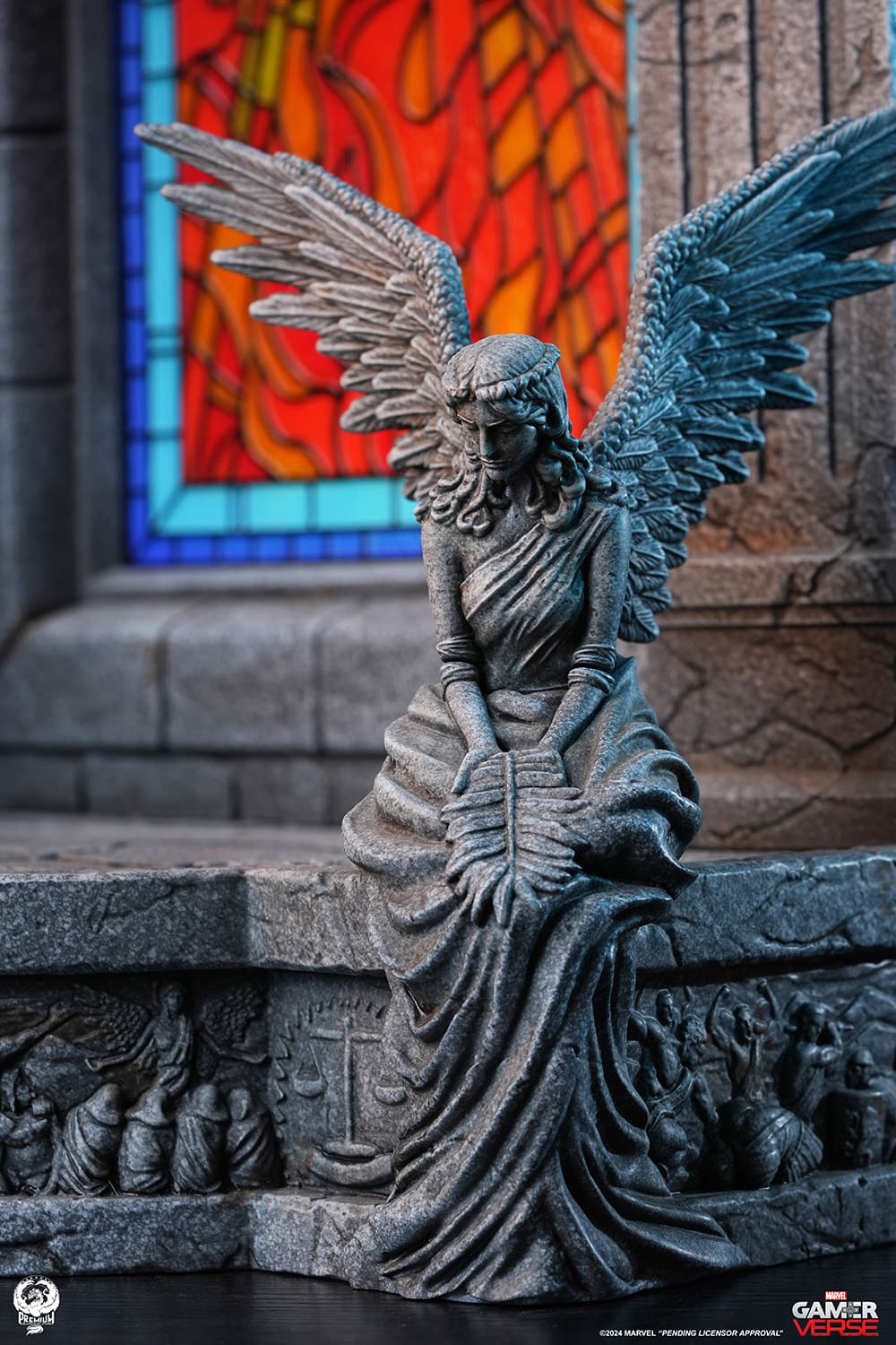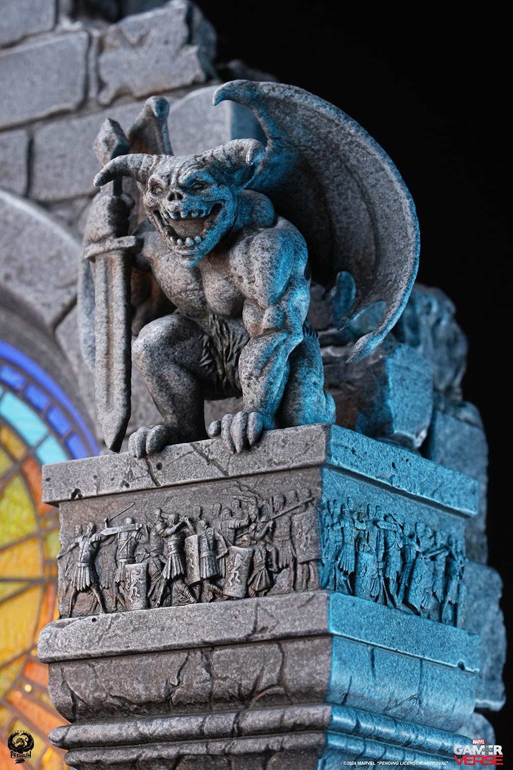 The base is a work of art unto itself. Framed by two stone columns topped with menacing gargoyles is the gothic arch housing the stained glass window our hero springs from. Fractured slivers of stained glass, possessing a lifelike translucency, appear to fly out from the broken window adding an uncanny level of movement to this statue.