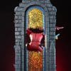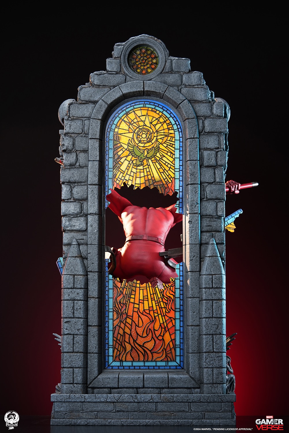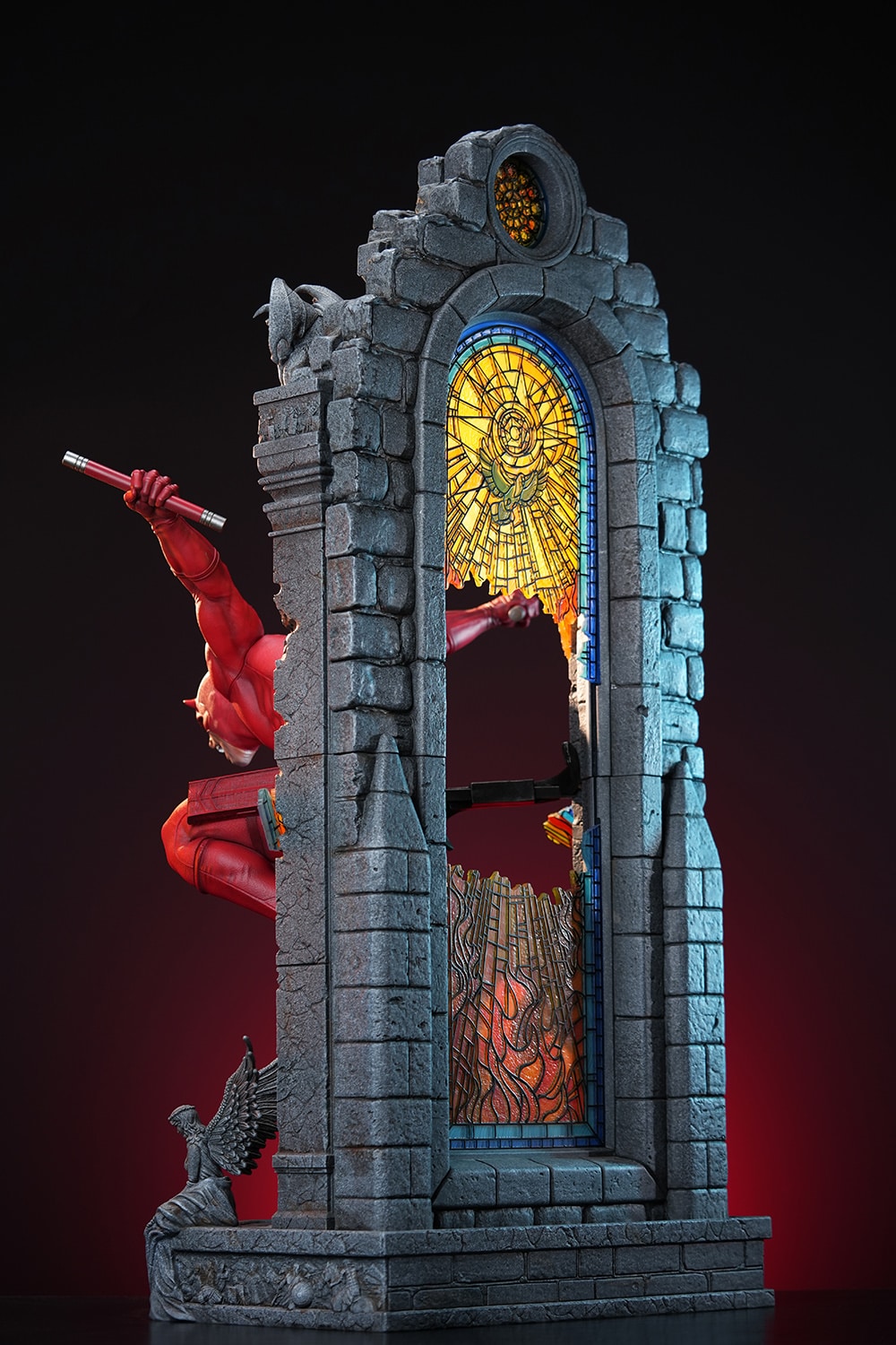 Standing at over 38” high, Daredevil is depicted bursting through a stained glass window, his knees tucked and arms spread wide in an iconic, dynamic pose. Clenched in each hand is a piece of his two-part billy club, his preferred tool for traversing the rooftops of Hell’s Kitchen. Every detail of Ol’ Hornheads costume has been recreated with expert care, from the seams on his red suit to the unique texture of his belt.