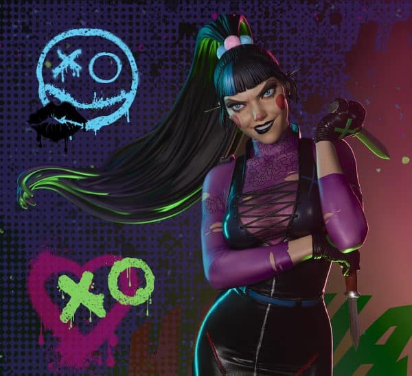 Inspired by the character’s appearance in The Joker War story arc, this fully sculpted comic book collectible depicts Punchline in a ripped purple bodysuit, black dress and corset bodice, knee-high black boots, and a small black cape. She wields her preferred weapon in her right hand while standing upon a circular pedestal resembling wooden baseboard and tarnished brass. The quarter scale DC statue includes two portraits: one neutral and enigmatic, the other devious, revealing the pleasure Punchline derives from her Super-Villain status. Each expression is accompanied by a long, high ponytail streaked by vivid blue.