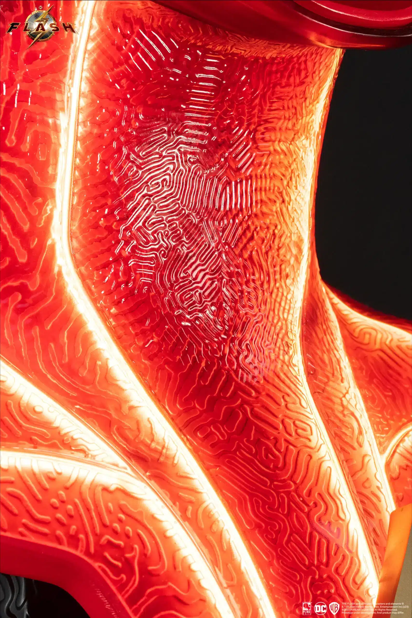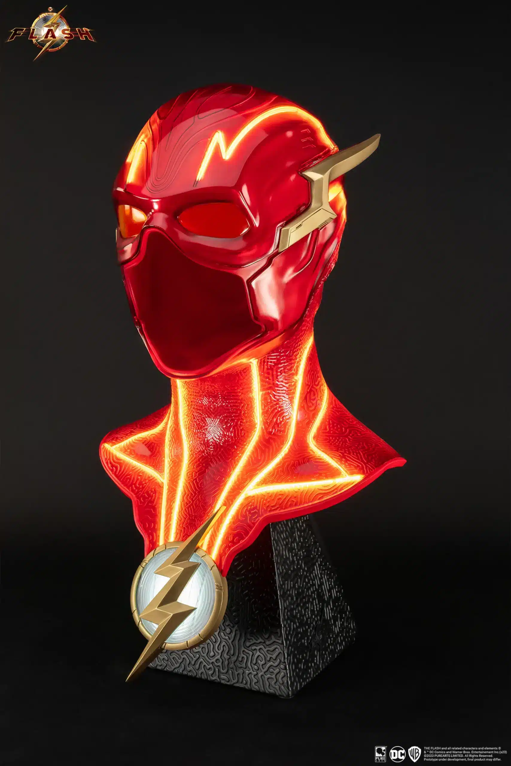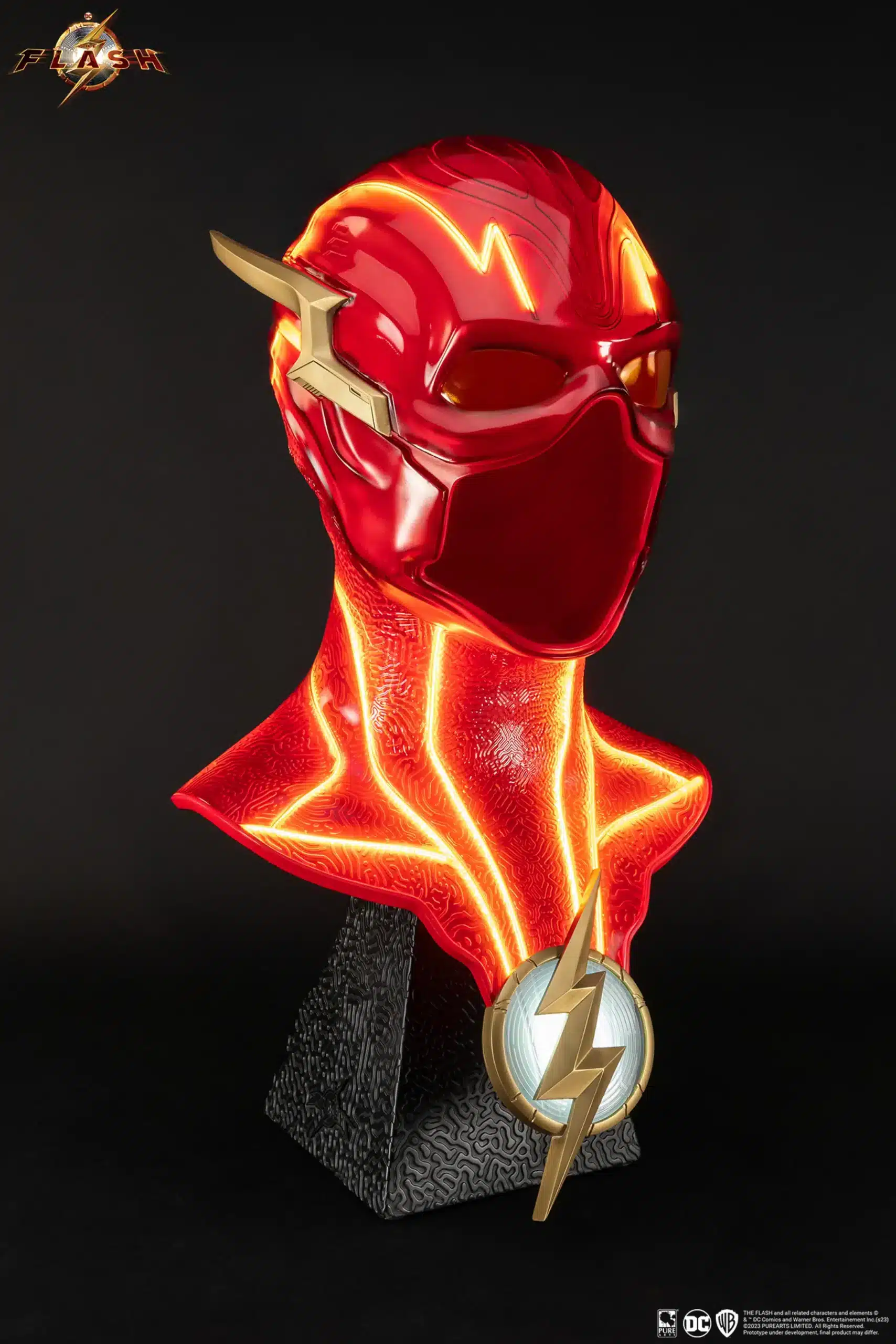 Fourth in our line of DC / Batman collectibles, our movie-perfect 1:1 scale replica of The Flash’s cowl raises the bar! Featuring an innovative multi-layer structure delivering a never-before-seen LED light system throughout the bright red mask. The vividly lit gold veining provides a truly electrifying accent to this piece.