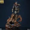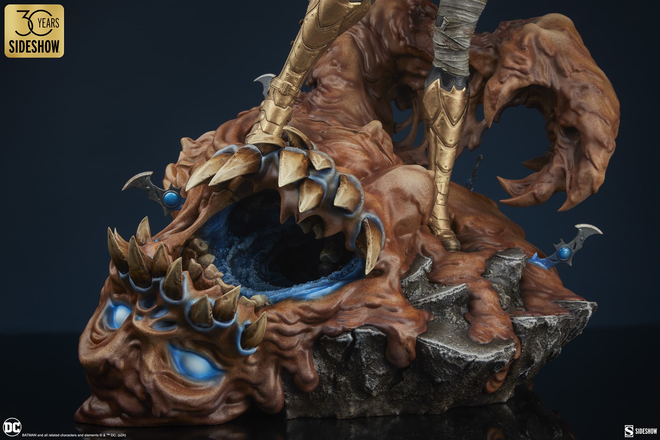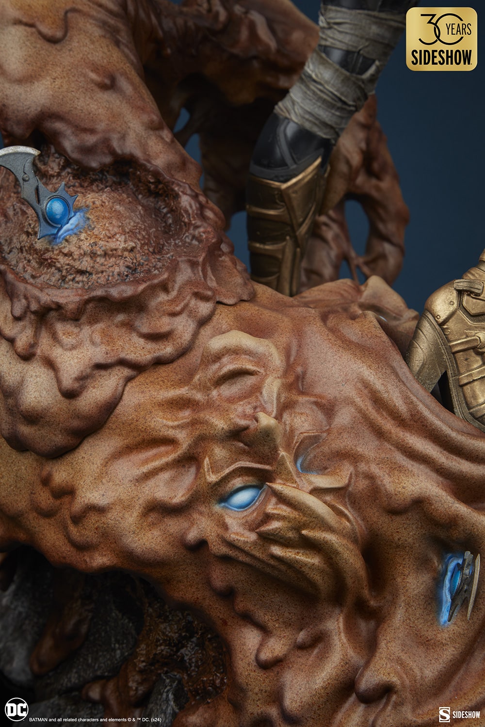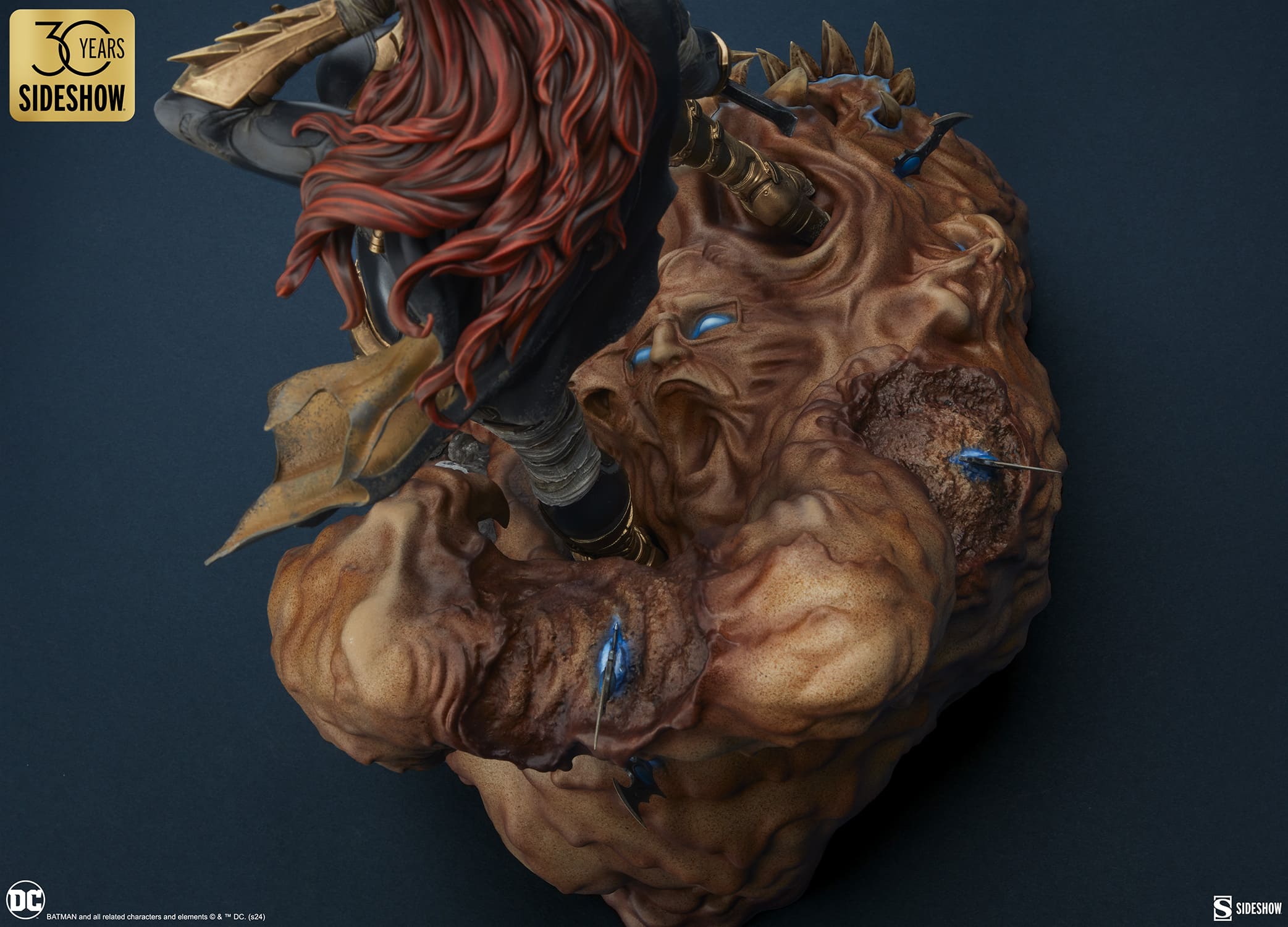 The polystone Batgirl Premium Format Figure measures 21.73” tall by 13.43” wide by 13.9” deep. Inspired by the characters as they appear in DC Comics, this collectible is fully sculpted to capture everything from her costume details down to the varied textures of Clayface’s body. Cloth-like bandages wrap Batgirl’s arms and legs, while her tactical Batsuit is accented with armored gold elements like gauntlets, boots, and a utility belt. Batgirl’s outfit is weathered to reflect the perils of crimefighting in Gotham City, and a tattered cape flutters off her shoulder. Below her, Clayface alternates between melting, muddy ooze and dried, cracked dirt where the Batarangs have zapped him.