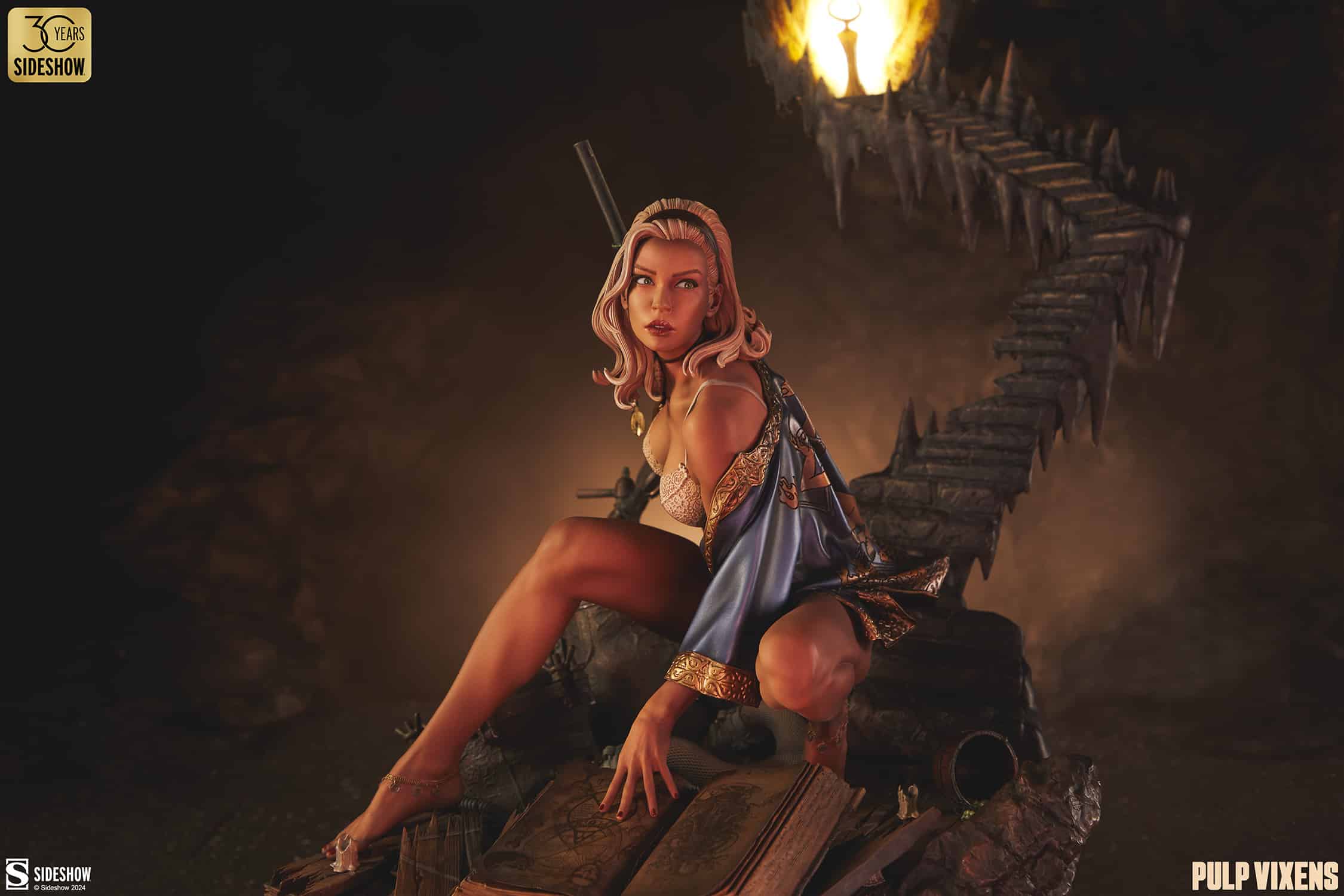 All eyes are on actress Ursula Strand in the Pulp Vixens: Mr. Sin Premium Format™ Figure, as she delves into the hidden laboratory of the wealthy Walter Chi-Jun Sin. What she uncovers there will shock and disturb the senses! This detailed collectible statue captures the very moment Ursula’s investigation is cut short by the arrival of Mr. Sin himself. Dressed in antique silks, the blonde bombshell crouches over one of Sin’s occult books, searching the lab for evidence connecting him to a string of grisly murders. Her guard is up and her gun is raised as the sound of footsteps echoes in the distance — could this be curtains for Ursula?