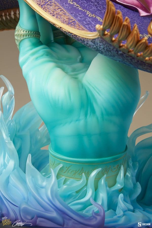 This Fairytale Fantasies collectible statue is fully sculpted and painted to perfection with shimmering, metallic colors and semi-translucent magic effects forming a treasure trove of details to explore. The ornate carpet is a sumptuous purple with gold accents and swooping tassels that give a sense of movement. The Sultana’s warm portrait features raven hair that flows in the wind as she soars. Finally, her pink costume has an airy look to it, with gold coin-like fringe that captures the light wherever she is displayed.
