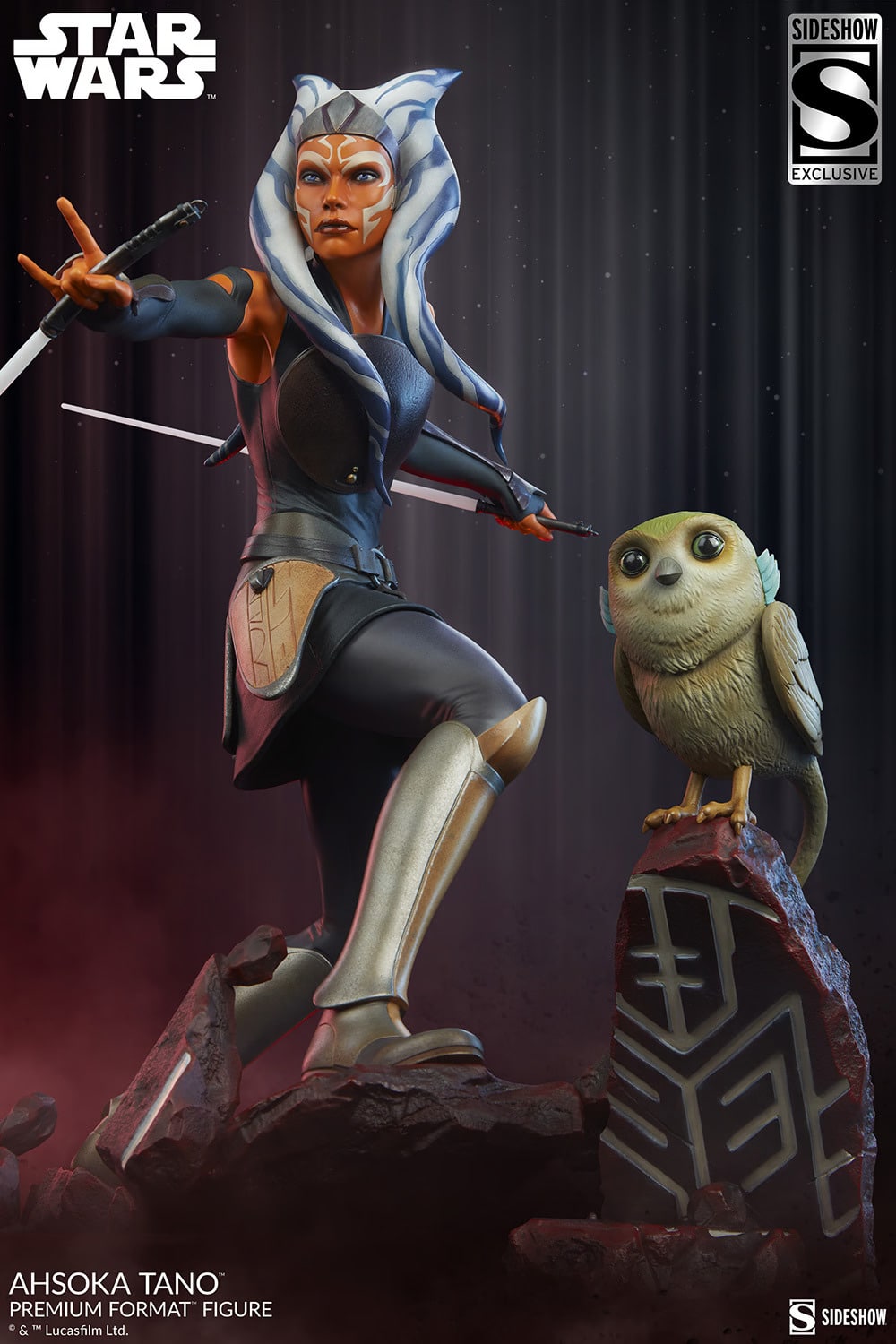 The Ahsoka Tano Premium Format Figure measures 19.5” tall and 14” wide as the Togruta warrior strikes a battle-ready stance on a Malachor-themed base, her iconic dual lightsabers at the ready. Surrounded by the crumbling structure of an ancient temple, Ahsoka steadies herself to use the Force and her former Jedi padawan training to confront the dangers of the dark side across the galaxy.