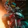 The Last Ronin 1:4 Scale Statue features two swap-out right arms holding his turtle tools of the trade: a katana formerly belonging to Leonardo and his own spinning nunchaku. With the sword in hand, the statue measures 21” tall, and with the nunchaku, the statue measures 24.75” tall. The piece also includes a removable sword handle for the sheath on his back when the sword arm is not on display. He also carries other tokens from his fallen brothers, like Donatello’s bo staff and Raphael’s sai. The Last Ronin Statue is completed with sculpted costuming details that capture Michelangelo’s new dystopian look, including his black domino mask and hood, weathered brown armor padding, and red goggles around his neck.