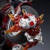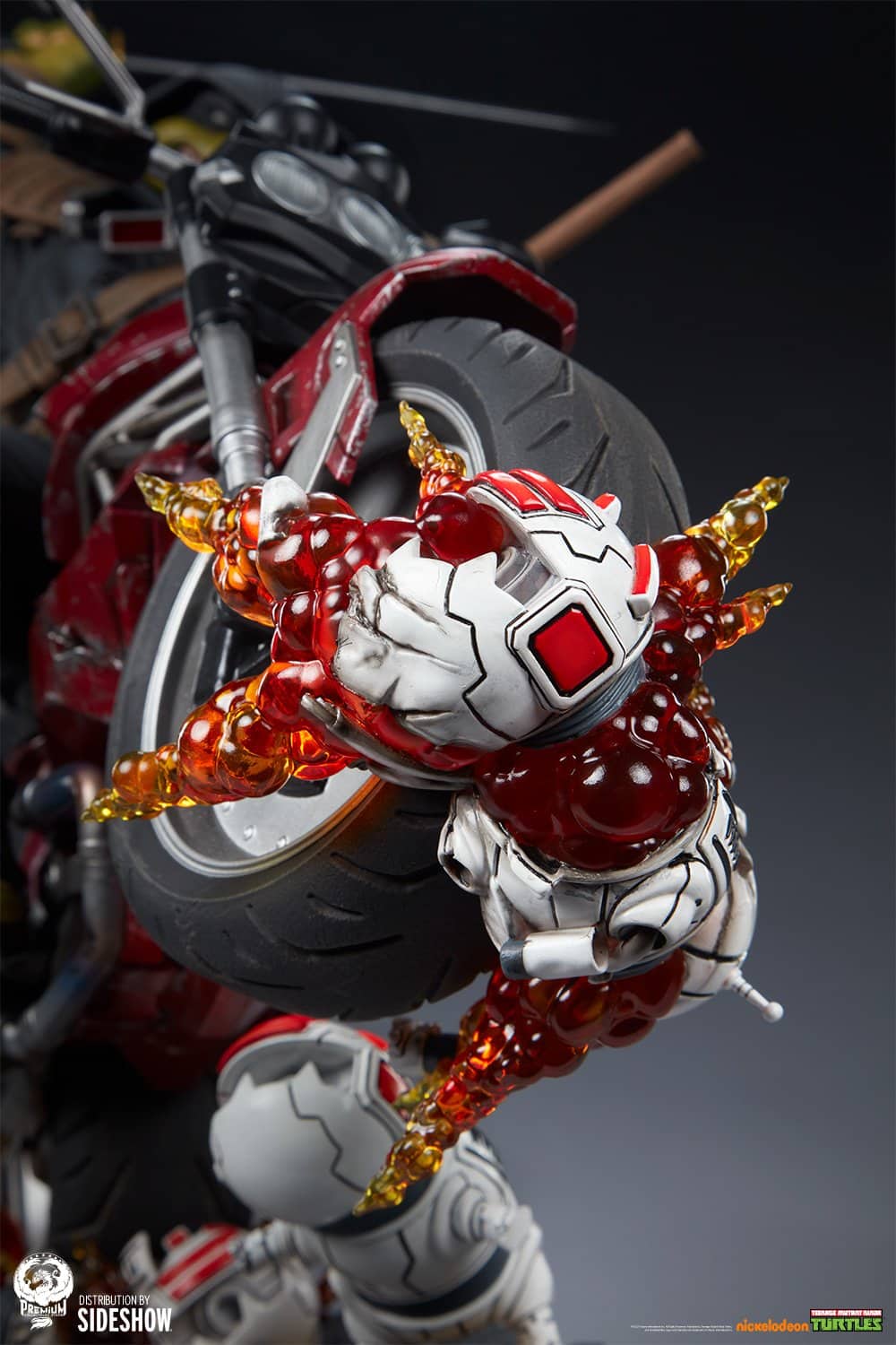 Michelangelo rides again — and this time he rides alone! The sole survivor of his band of brothers, this once-playful Ninja Turtle has become the Last Ronin in order to take on the Foot Clan. The elaborate TMNT statue measures 23.25” wide as Mikey mows down a series of canine M112 Mousers with his red motorcycle. Red translucent explosions burst from the broken robots on the streets above his sewer home, and the fully realized bike features metallic exhaust burns, sculpted treads, and paint weathering.