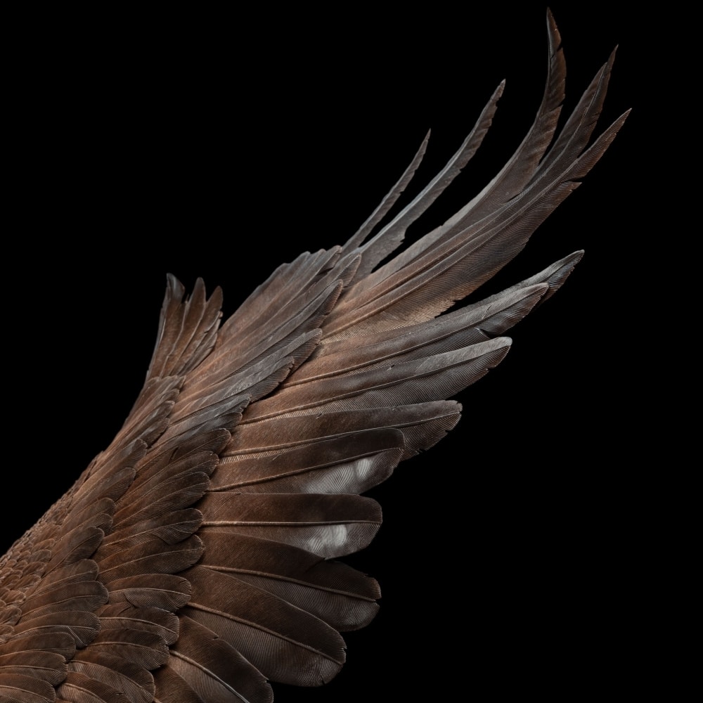 Utilizing a variety of reference materials, from comprehensive feather maps to a (safely acquired) taxidermy NZ falcon, Gary initially created approximately 40 individually sculpted feathers as a base. Then from that base set, he re-sized, bent, curled, rippled, notched, and split each and every single feather, taking into account weight, speed, updraft, motion, and placement. “To fit that amount of detail on to so many feathers that were constantly editable required me to work between 10 massive files simultaneously, in addition the underlying sketch as a template. Primary feathers, Secondary and Alula, tail, head, neck, talons, left leg, right leg, chest, back, front tiny wing feathers both right and left, and then the base plus the characters.”