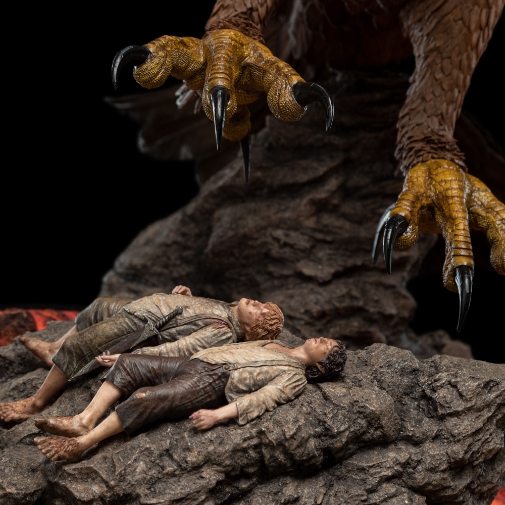 Understanding the amount of work and meticulous detail required for this grand piece, we turned to sculpting and Middle-earth master, Gary Hunt. “Even though I have digitally sculpted 2 eagles previously, this wasn’t enough to prepare me for the work I would have to do for an eagle of this scale! Originally, a 1/6th scale version was discussed; this would’ve made the wingspan over 2 metres and just the initial tests alone scared me! Getting the amount of photorealistic detail onto each feather was going to be a hard task, but luckily, I had a fantastic team behind me to help.”  The WETA Workshop Masters Collection Salvation at Mount Doom Statue Lord Of The Rings Limited Edition Collectible is an absolute peak of creation.