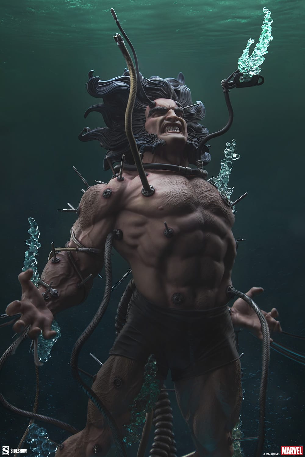 Measuring 25.25” tall, 14.13” wide, and 10.88” deep, the Wolverine: Weapon X Premium Format Figure shows Logan as he endures the excruciating procedure which gave him an Adamantium skeleton. Suspended in an underwater tank, Department K’s latest test subject grits his teeth while he writhes in agony. Sharp sprues and tubes protrude painfully from all over Wolverine’s bare body, injecting an indestructible steel alloy to fuse to his bone structure — including the claws which extend from the feral mutant’s aching knuckles.